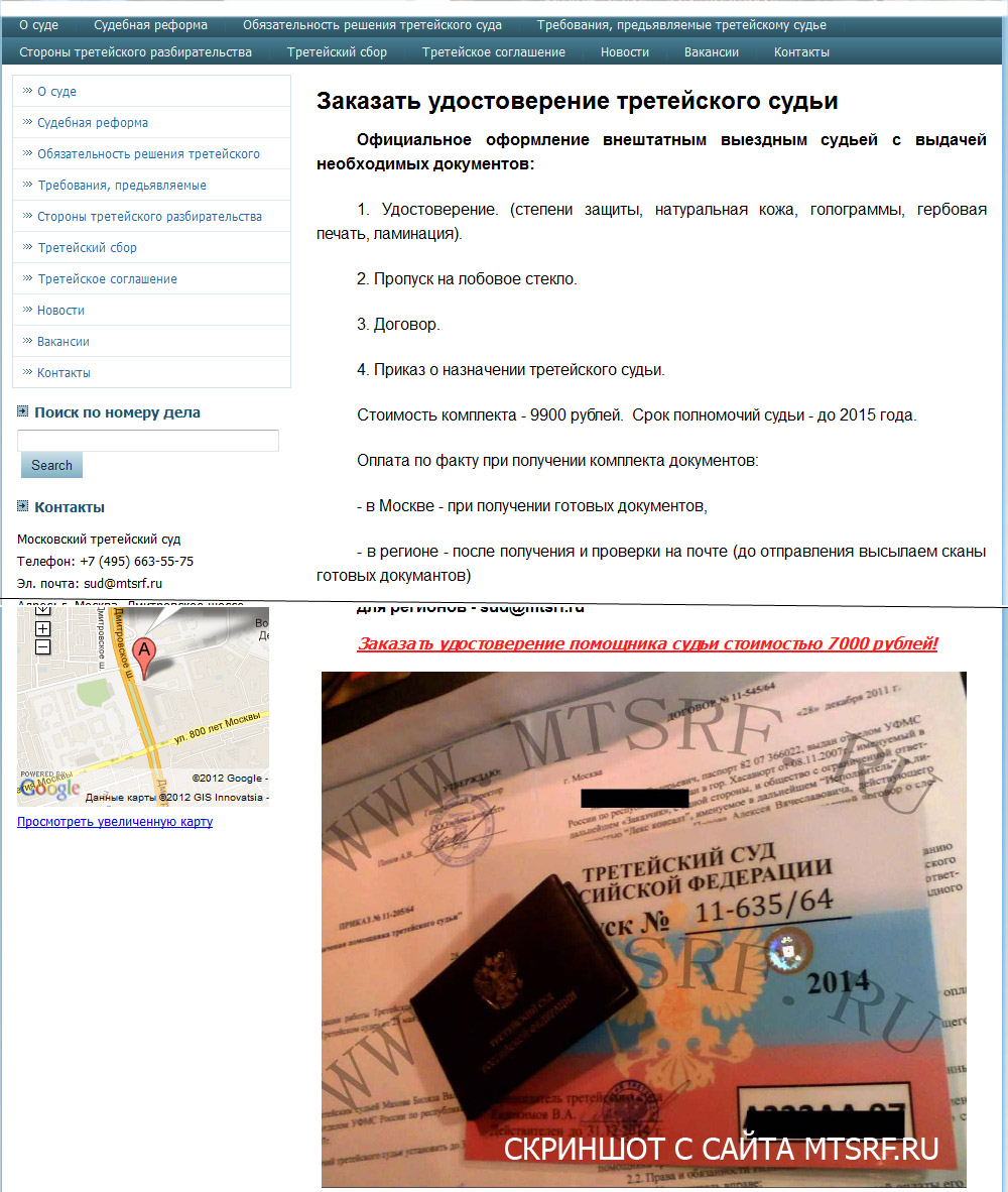 На сайте «третейского суда» нет необходимой для ведения деятельности информации: ни списка третейских судей, ни графика заседаний. Кроме того, информация сайта вводит в заблуждение граждан: удостоверение третейского судьи не даёт никаких преференций и преимуществ, в том числе и судебной неприкосновенности. Так что недобросовестные торговцы документами обманывают граждан дважды.